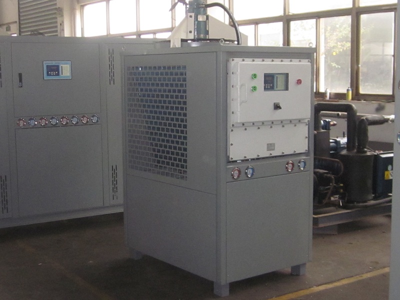 研磨機行業用冷水機:三輥機在研磨過程,由于分子結構發生變化產生溫度,溫度過高影響原料的質量,生產效率,對設備磨損嚴重。運用冷水機循環冷卻控制溫度,可以大大提高生產量,減少設備的損壞。重要的是保護員工安全。
